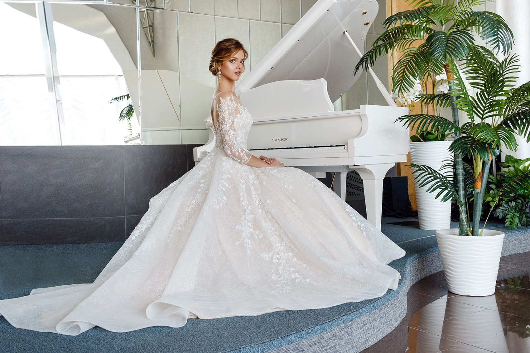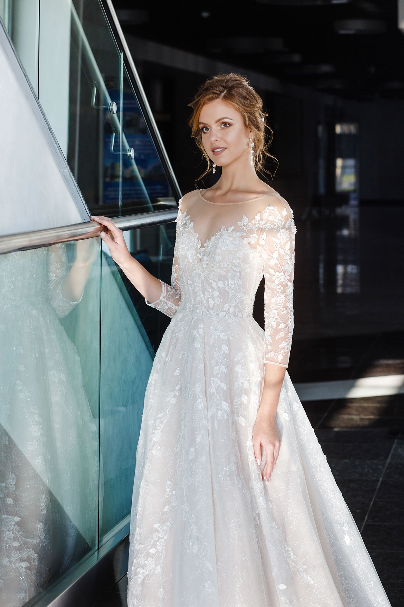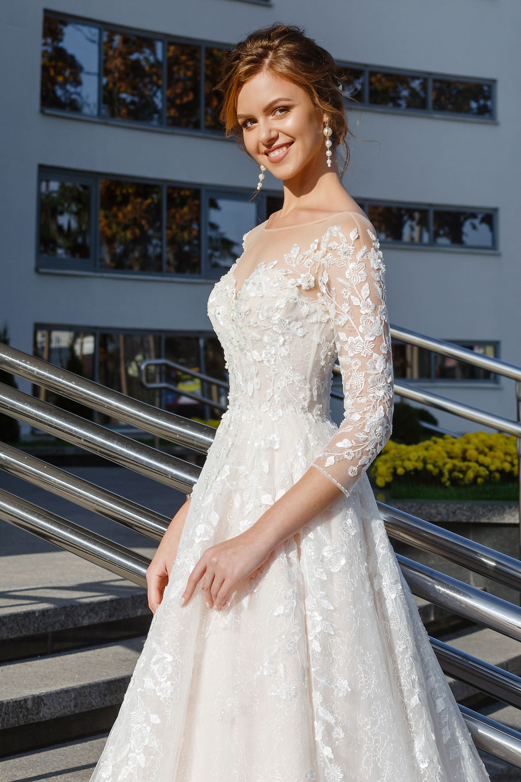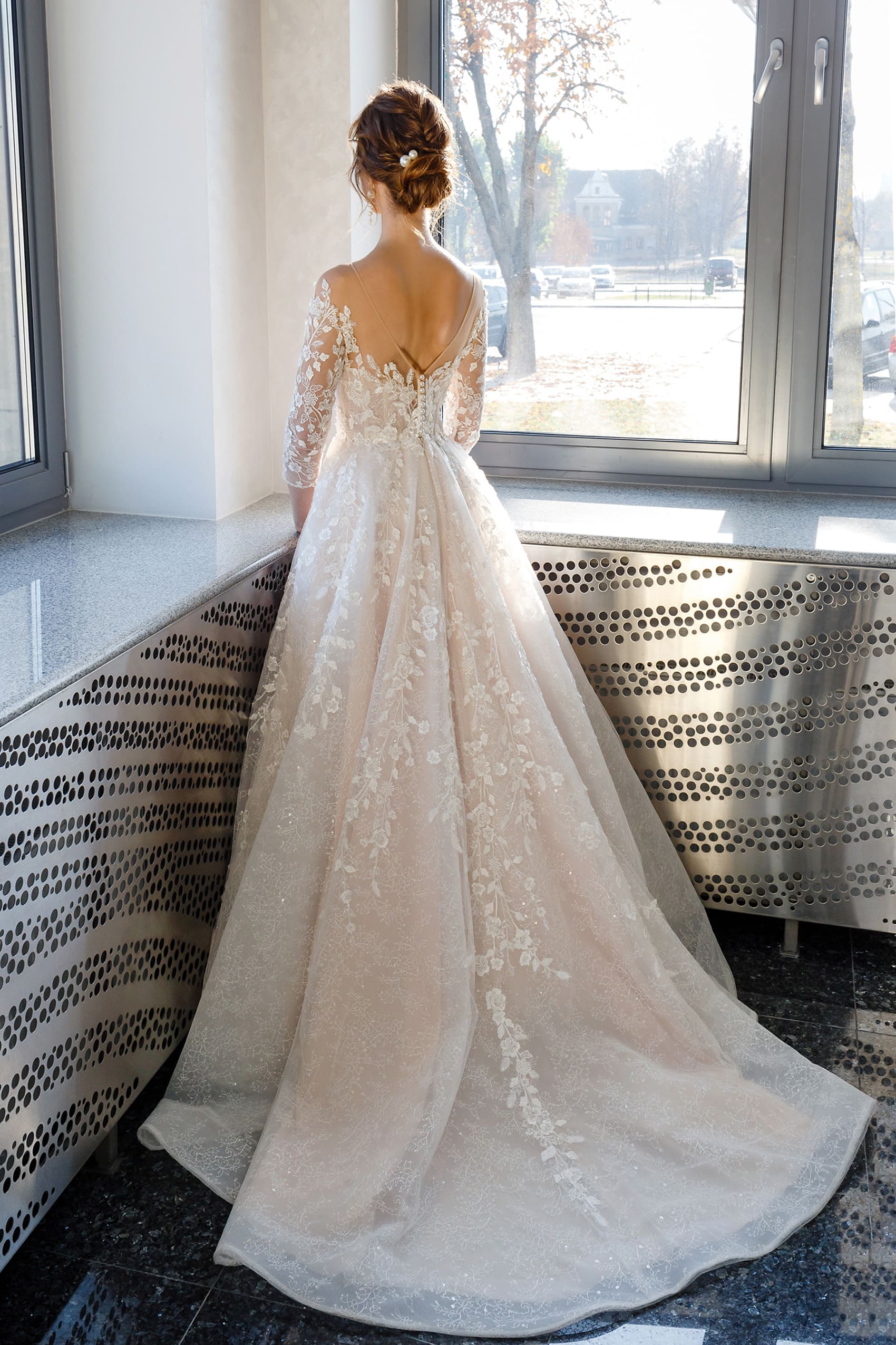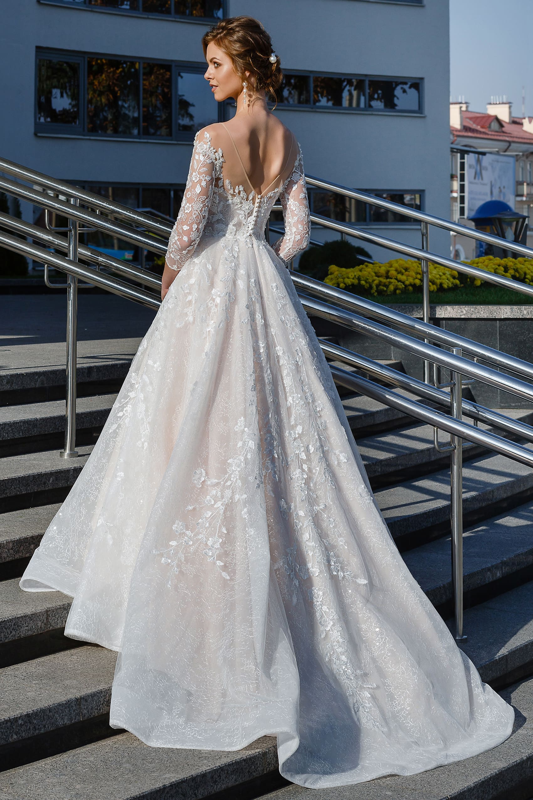Это Свадебное платье А-Силуэт изготовлено из Сетка, Кружево, Фатин и украшено блестками, Имитация жемчуга, Бусины.