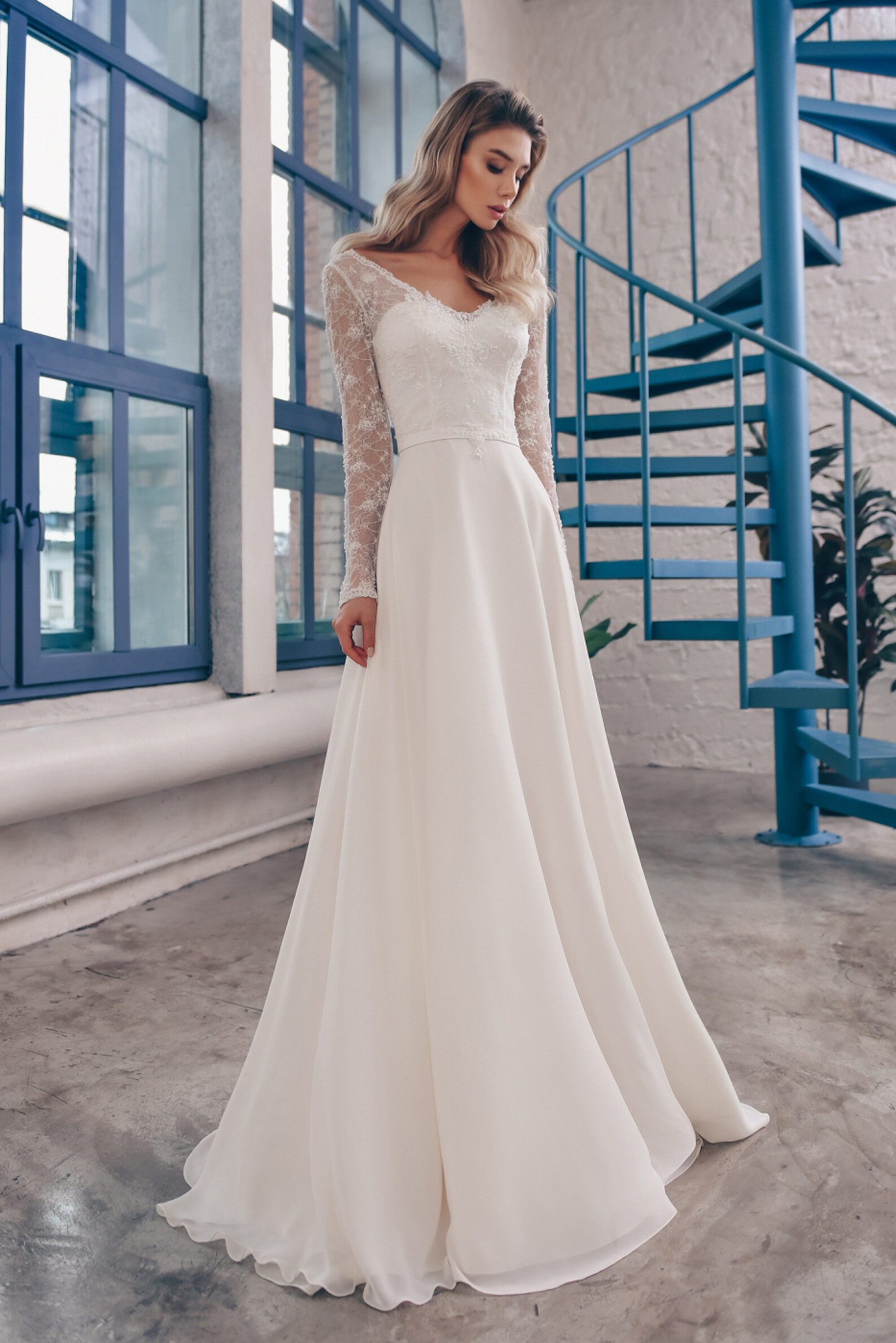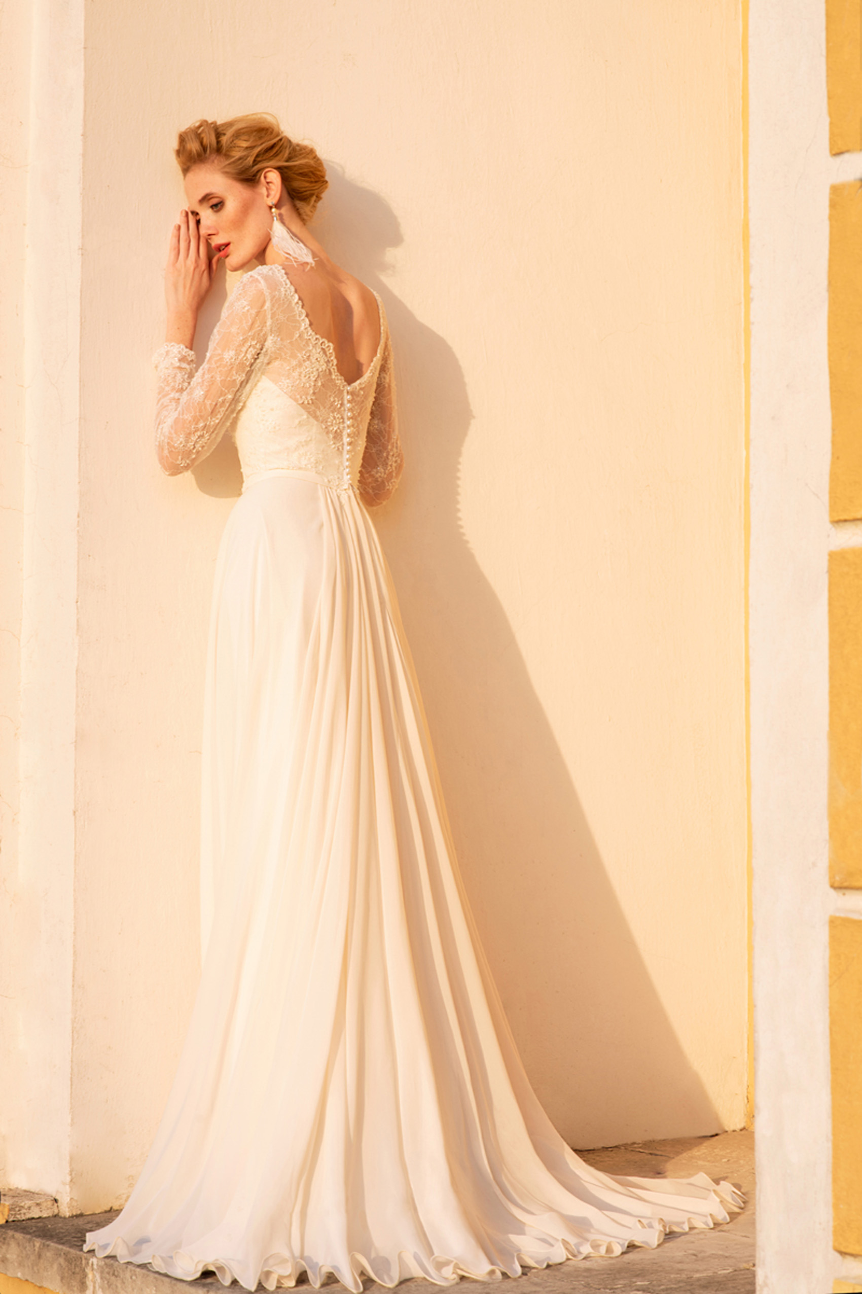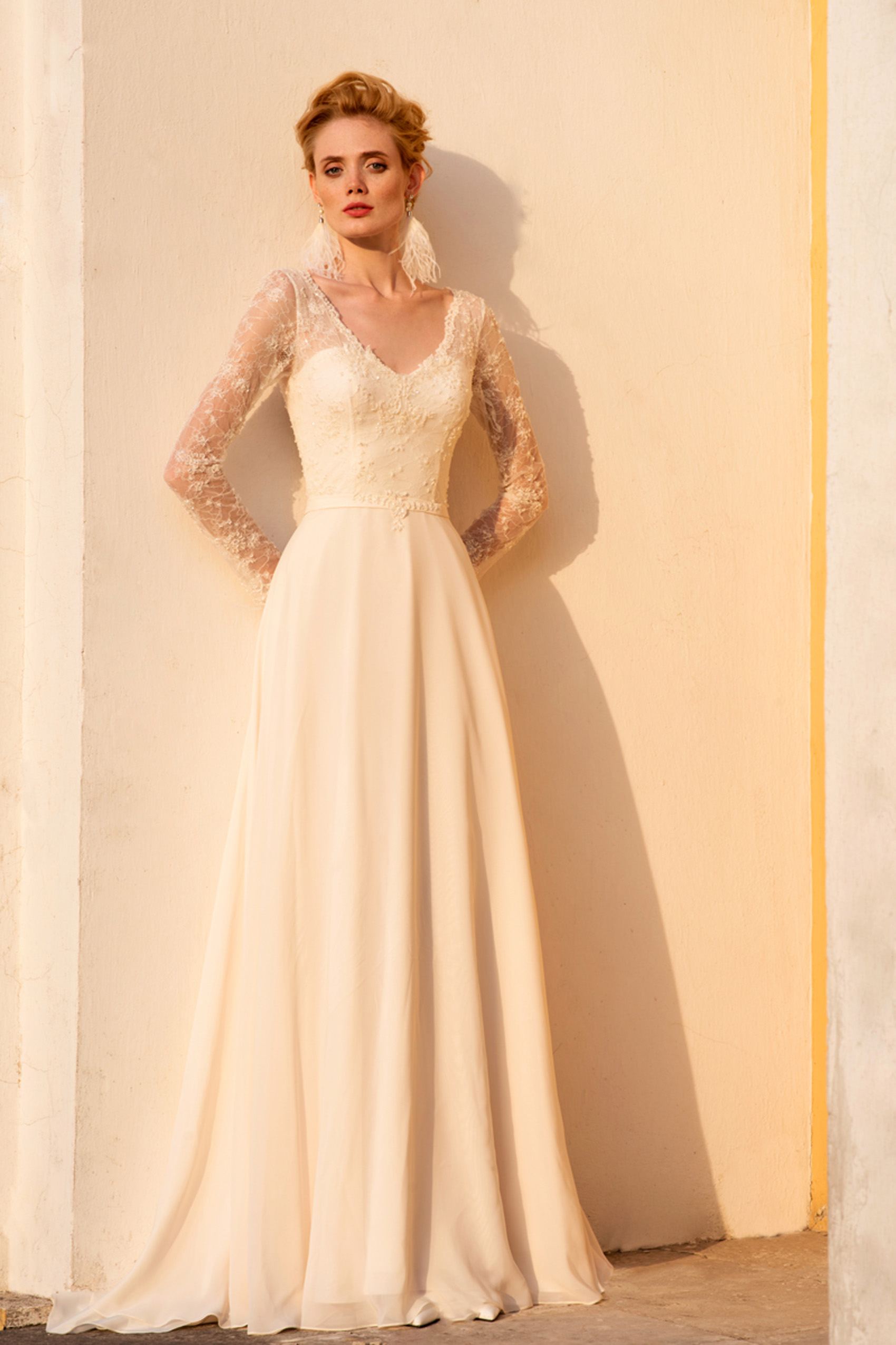 Это Свадебное платье А- Силуэт изготовлено из шифон и Кружево Шантильи с декором и имитация жемчуга.