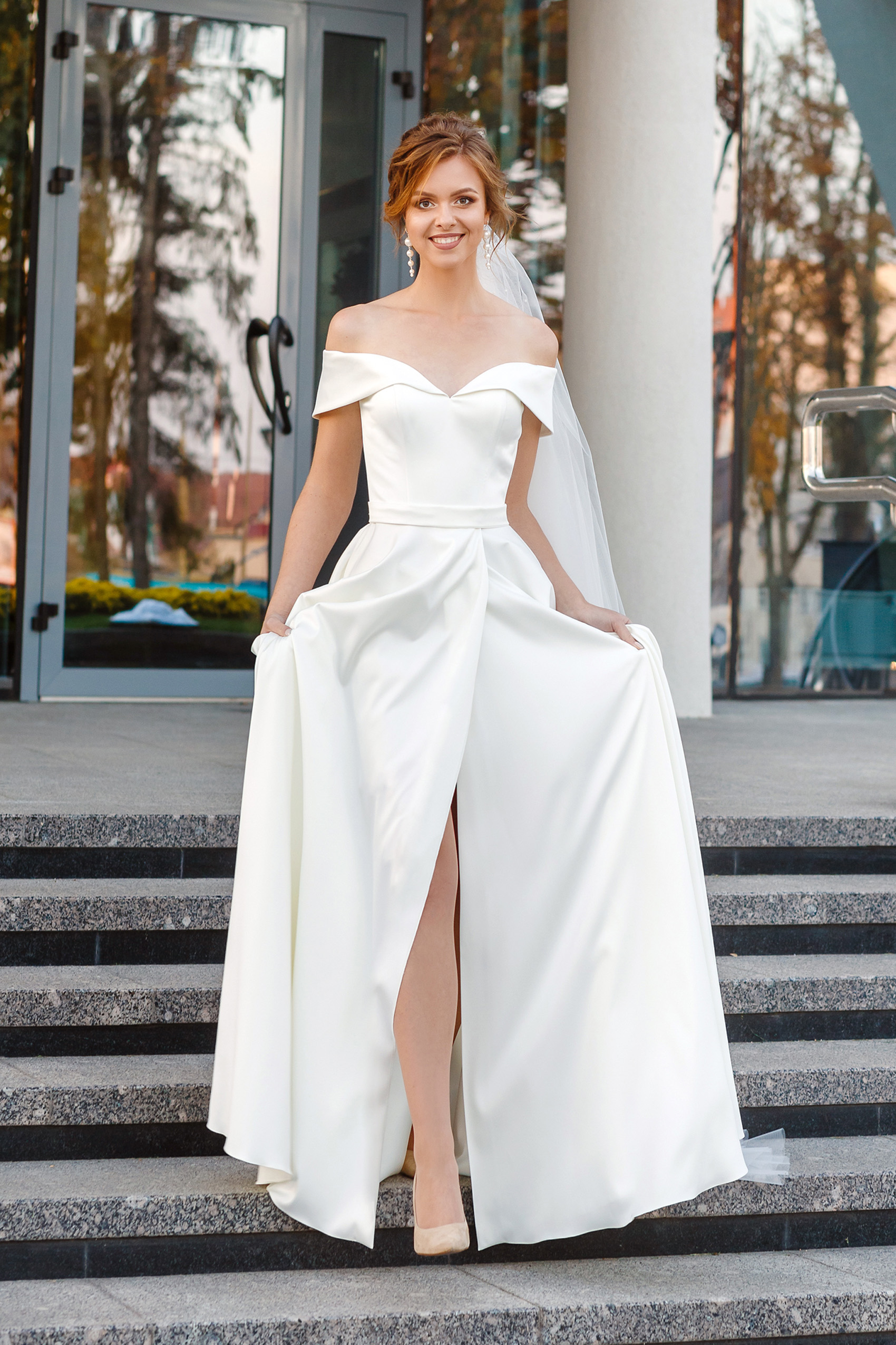 Это Свадебное платье А-Силуэт изготовлено из атлас.